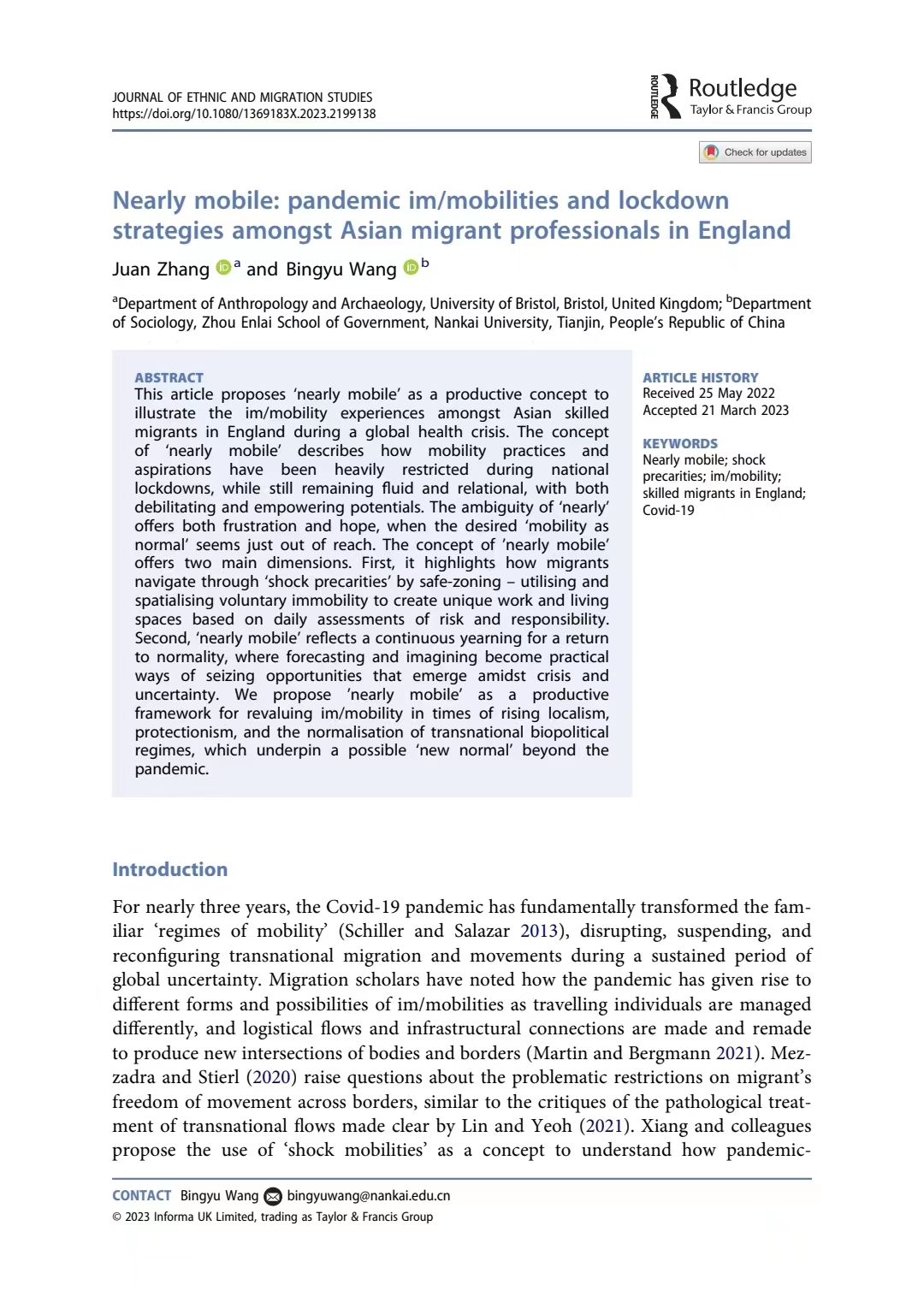 近期,英国365集团公司周恩来政府管理公司社学系王炳钰教授(作为通讯作者)与布里斯托大学人类学与考古学系张娟副教授的最新合作文章于2023年4月12日在线发表于移民和族群研究顶刊Journal of Ethnic and Migration Studies (JEMS),文章题为Nearly mobile: pandemic im/mobilities and lockdown strategies amongst Asian migrant professionals in England。所发表期刊JEMS为英文核心期刊(SSCI)一区刊物(Journal Citation Reports-Q1);作为移民研究国际权威刊物,JEMS在JCR“族群研究”与“人口学”两个类别均排名世界第1,在谷歌学术“移民研究”和“社会学”两个类别的世界排名分别为第1和第2。本期推文将对这篇文章的研究问题、研究发现以及主要贡献进行介绍。