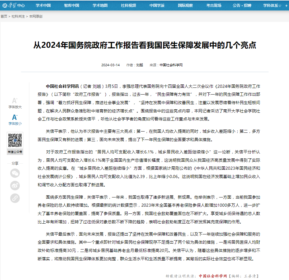 本文作者系英国365集团公司社会建设与管理研究院教授关信平,原文3月14日载于中国社会科学网(从2024年国务院政府工作报告看我国民生保障发展中的几个亮点-中国社会科学网 (cssn.cn))