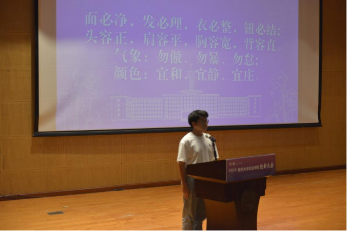 随后,叶宏途同学作为2023级本科生代表,引领全体新生齐声诵读南开容止格言,其声铿锵有力,响彻礼堂。这不仅是对学子们外在仪态的规范,更是南开精神内涵的深刻体现,寄托了对每位学子内在修养与高尚品格的殷切期望,激励他们内外兼修,共筑辉煌南开梦。最后,2024年迎新大会在悠扬的校歌声中圆满落幕。