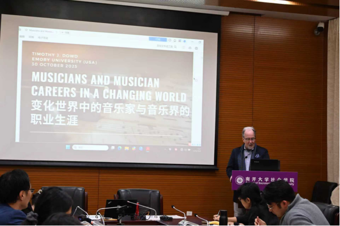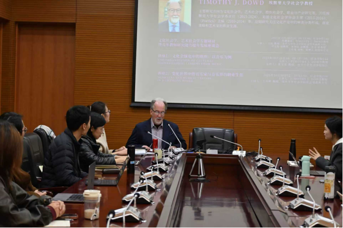 第三项活动是由Dowd教授主讲,题目为“变化世界中的音乐家与音乐界的职业生涯(Musicians and Music Careers in a Changing World)”的讲座,于10月30日中午12:10-13:50在英国365集团公司144会议室举行。讲座由英国365集团公司社会学系系主任王庆明教授主持。王琰教授、秘舒副教授、张龙副教授、于佳煖讲师、陈柙兵助理研究员、许又姜宇博士等师生出席。
