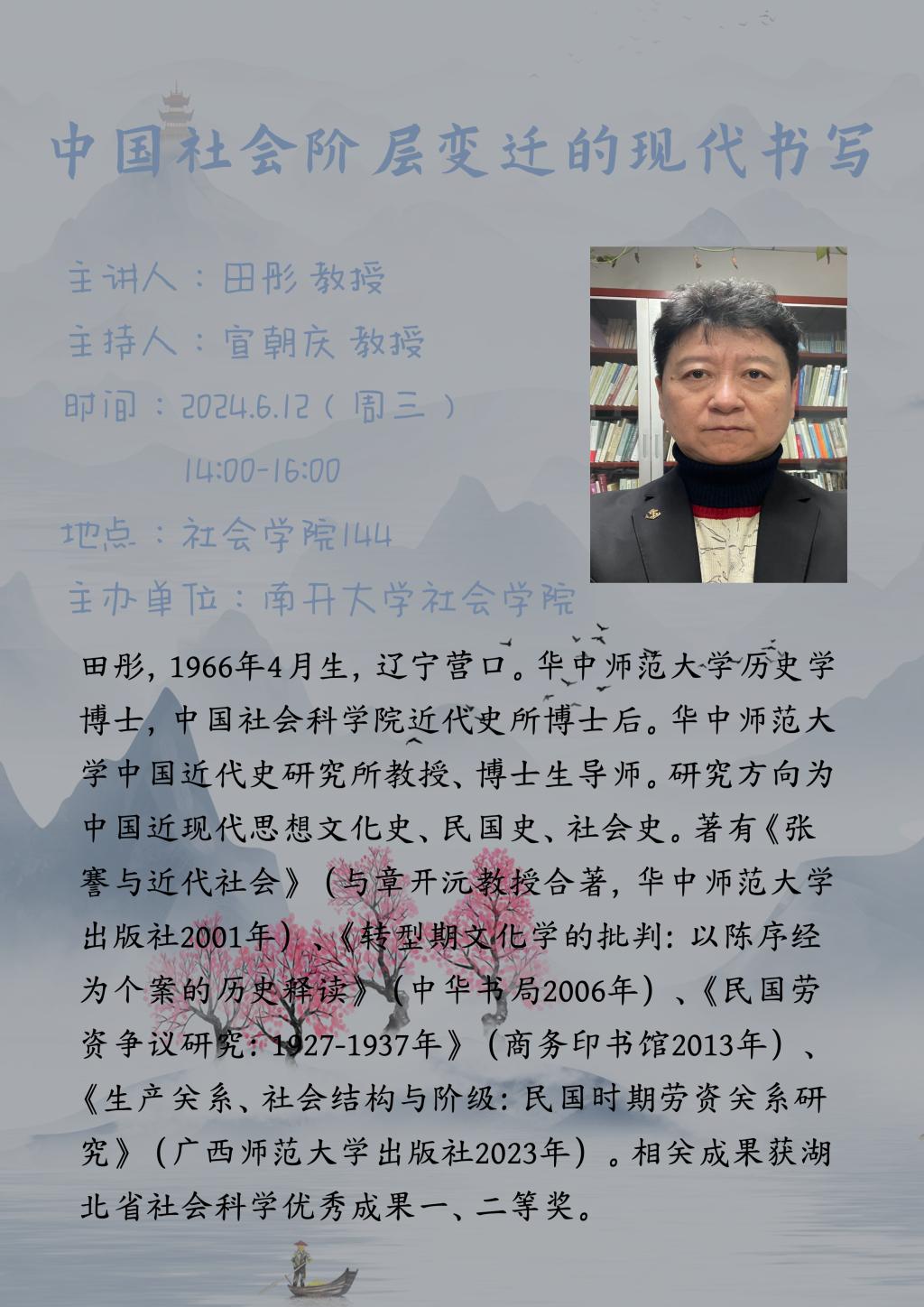 田彤,1966年4月生,辽宁营口。华中师范大学历史学博士,中国社会科公司近代史所博士后。华中师范大学中国近代史研究所教授、博士生导师。研究方向为中国近现代思想文化史、民国史、社会史。著有《张謇与近代社会》(与章开沅教授合著,华中师范大学《转型期文化学的批判:以陈序经出版社2001年)中华书局2006年)、《民国劳为个案的历史释读》资争议研究:1927-1937年》(商务印书馆2013年)《生产关系、社会结构与阶级:民国时期劳资关系研究》(广西师范大学出版社2023年)。相关成果获湖北省社会科学优秀成果一、二等奖