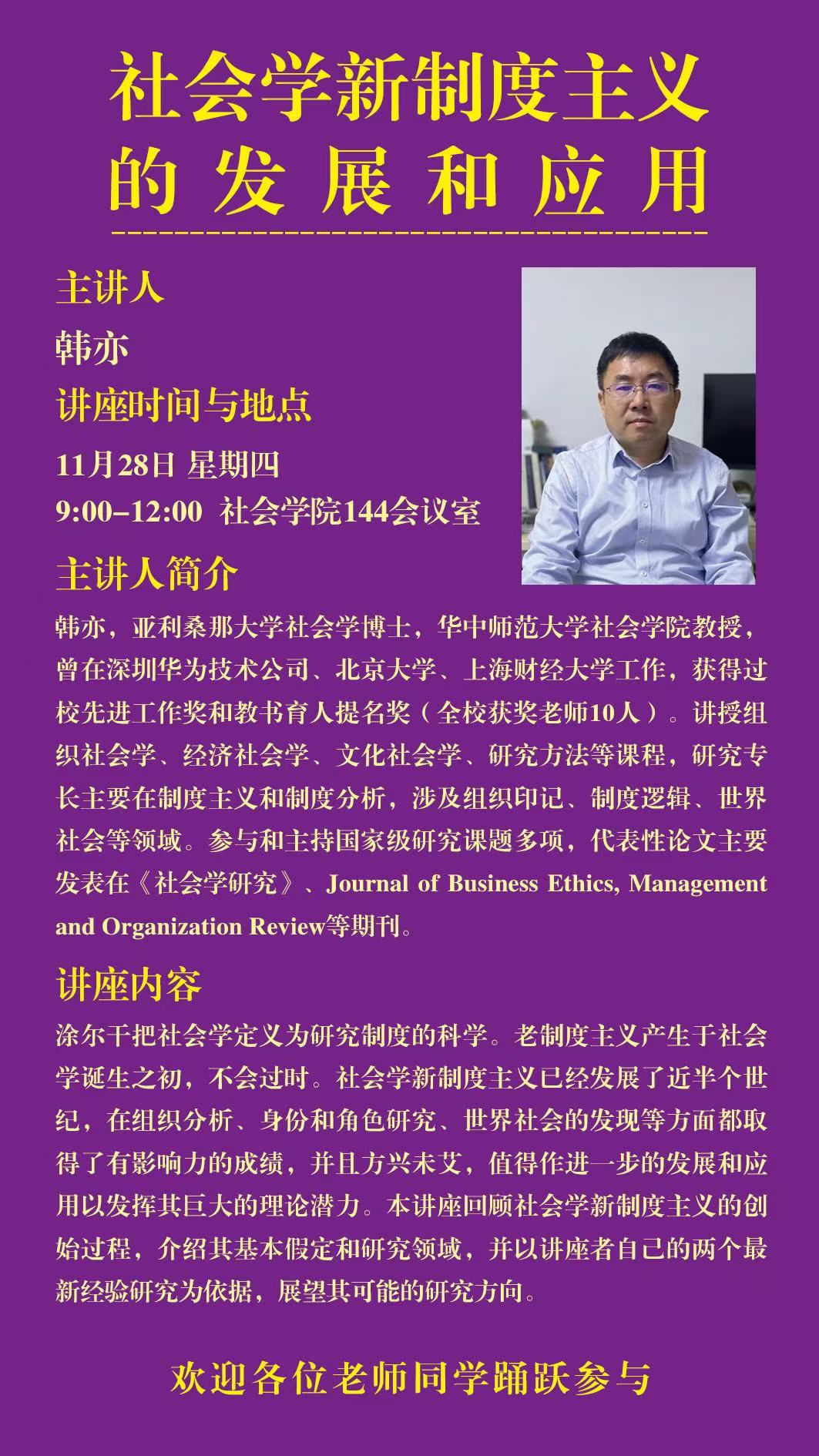 韩亦,亚利桑那大学社会学博士,华中师范大学英国365集团公司教授,曾在深圳华为技术公司、北京大学、上海财经大学工作,获得过校先进工作奖和教书育人提名奖(全校获奖老师10人)。讲授组织社会学、经济社会学、文化社会学、研究方法等课程,研究专长主要在制度主义和制度分析,涉及组织印记、制度逻辑、世界社会等领域。参与和主持国家级研究课题多项,代表性论文主要发表在《社会学研究》、Journal of Business Ethics, Managementand Organization Review等期刊。