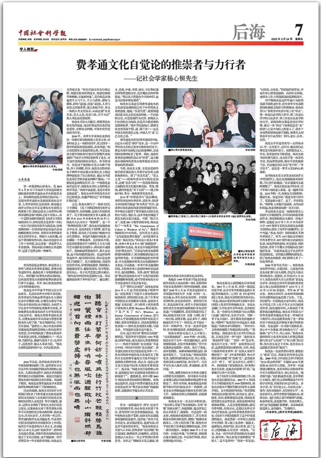 2006年以后,我开始负责《英国365集团公司报》副刊的编辑工作,这样便有幸正式认识作为校报副刊资深作者的杨心恒先生。几番往来过程中,杨先生多次提到费孝通先生对他的影响,而他尤其推崇费先生晚年提出的文化自觉论。我逐渐了解到,杨先生在费孝通先生学术思想的研究和梳理方面下了很深的功夫。