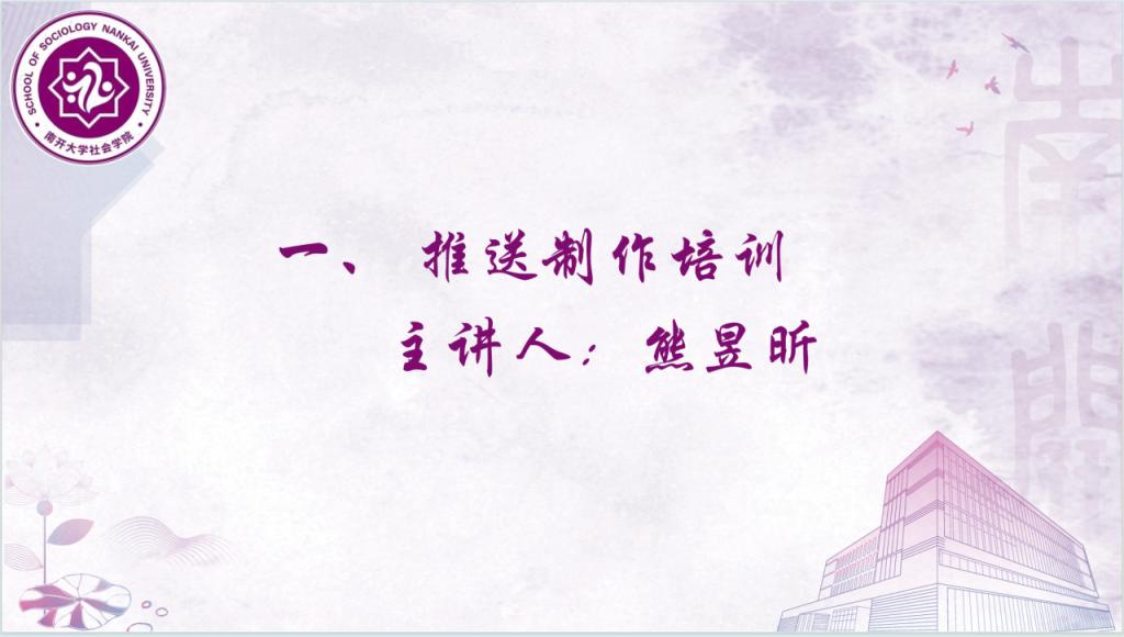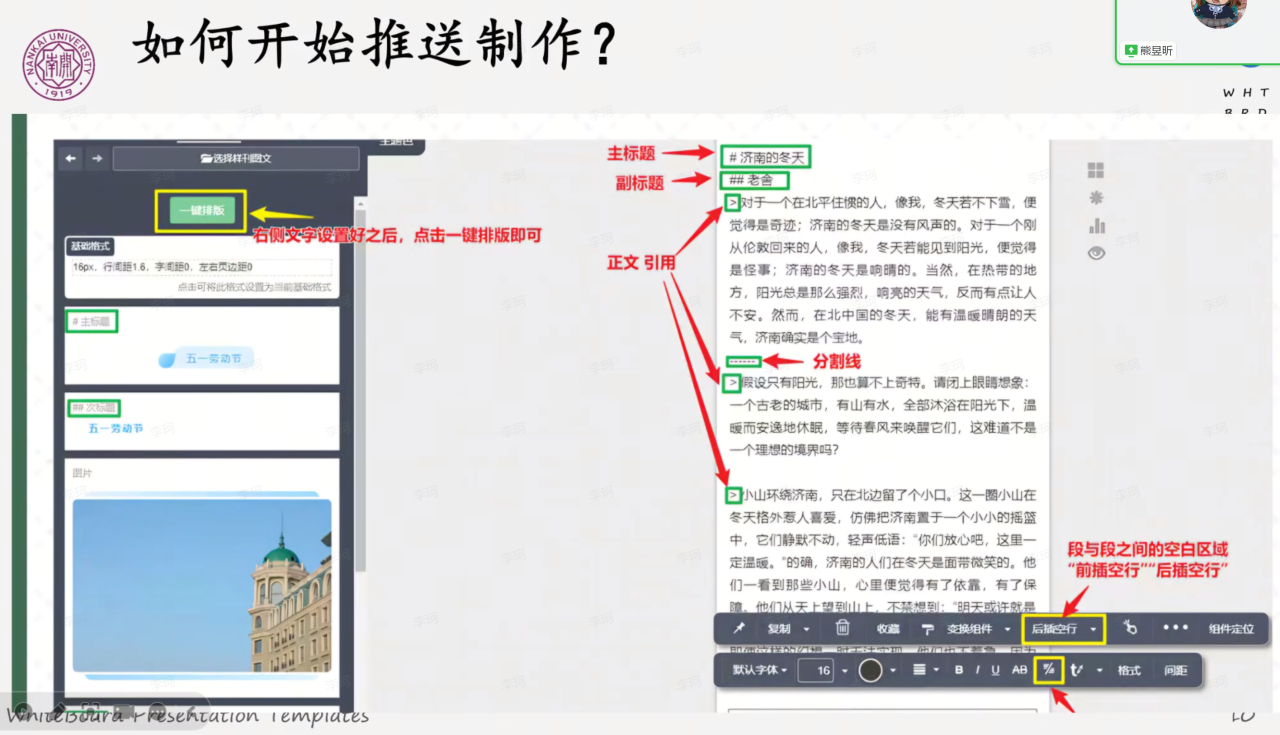 会议第一部分,团委宣传部运营中心熊昱昕依托秀米平台为参会成员们演示了宣传推送的制作方法,以完整制作一篇优质推送的全流程为思路,重点介绍了设置样刊模板、背景与布局方法、工具栏与编辑区功能、排版要求、图文生成与分享等内容,为各部门工作人员学习制作推文提供了详尽的基础性指引。